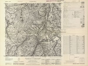 Hier finden Sie ein Meßtischblätter 1:25.000, von Deutschland, aus der Zeit der 1930er Jahre. Diese Karte wurde von Amerikanern damals bei Eisenschmidt gekauft und wurde in den USA für das amerikanische, später britische und französische Militär, bearbeitet. Überarbeitet in Form von Färbungen und Markierungen wurden diese Karten bis in die 50er Jahre.