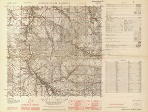 Hier finden Sie ein Meßtischblätter 1:25.000, von Deutschland, aus der Zeit der 1930er Jahre. Diese Karte wurde von Amerikanern damals bei Eisenschmidt gekauft und wurde in den USA für das amerikanische, später britische und französische Militär, bearbeitet. Überarbeitet in Form von Färbungen und Markierungen wurden diese Karten bis in die 50er Jahre.