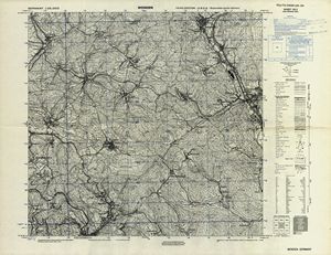 Hier finden Sie ein Meßtischblätter 1:25.000, von Deutschland, aus der Zeit der 1930er Jahre. Diese Karte wurde von Amerikanern damals bei Eisenschmidt gekauft und wurde in den USA für das amerikanische, später britische und französische Militär, bearbeitet. Überarbeitet in Form von Färbungen und Markierungen wurden diese Karten bis in die 50er Jahre.