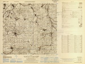 Hier finden Sie ein Meßtischblätter 1:25.000, von Deutschland, aus der Zeit der 1930er Jahre. Diese Karte wurde von Amerikanern damals bei Eisenschmidt gekauft und wurde in den USA für das amerikanische, später britische und französische Militär, bearbeitet. Überarbeitet in Form von Färbungen und Markierungen wurden diese Karten bis in die 50er Jahre.