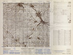 Hier finden Sie ein Meßtischblätter 1:25.000, von Deutschland, aus der Zeit der 1930er Jahre. Diese Karte wurde von Amerikanern damals bei Eisenschmidt gekauft und wurde in den USA für das amerikanische, später britische und französische Militär, bearbeitet. Überarbeitet in Form von Färbungen und Markierungen wurden diese Karten bis in die 50er Jahre.