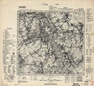 Hier finden Sie ein Meßtischblätter 1:25.000, von Deutschland, aus der Zeit der 1930er Jahre. Diese Karte wurde von Amerikanern damals bei Eisenschmidt gekauft und wurde in den USA für das amerikanische, später britische und französische Militär, bearbeitet. Überarbeitet in Form von Färbungen und Markierungen wurden diese Karten bis in die 50er Jahre.