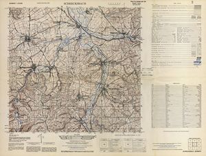 Hier finden Sie ein Meßtischblätter 1:25.000, von Deutschland, aus der Zeit der 1930er Jahre. Diese Karte wurde von Amerikanern damals bei Eisenschmidt gekauft und wurde in den USA für das amerikanische, später britische und französische Militär, bearbeitet. Überarbeitet in Form von Färbungen und Markierungen wurden diese Karten bis in die 50er Jahre.