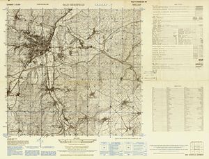 Hier finden Sie ein Meßtischblätter 1:25.000, von Deutschland, aus der Zeit der 1930er Jahre. Diese Karte wurde von Amerikanern damals bei Eisenschmidt gekauft und wurde in den USA für das amerikanische, später britische und französische Militär, bearbeitet. Überarbeitet in Form von Färbungen und Markierungen wurden diese Karten bis in die 50er Jahre.