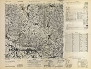 Hier finden Sie ein Meßtischblätter 1:25.000, von Deutschland, aus der Zeit der 1930er Jahre. Diese Karte wurde von Amerikanern damals bei Eisenschmidt gekauft und wurde in den USA für das amerikanische, später britische und französische Militär, bearbeitet. Überarbeitet in Form von Färbungen und Markierungen wurden diese Karten bis in die 50er Jahre.
