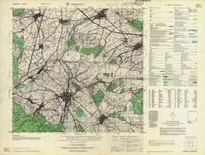 Hier finden Sie ein Meßtischblätter 1:25.000, von Deutschland, aus der Zeit der 1930er Jahre. Diese Karte wurde von Amerikanern damals bei Eisenschmidt gekauft und wurde in den USA für das amerikanische, später britische und französische Militär, bearbeitet. Überarbeitet in Form von Färbungen und Markierungen wurden diese Karten bis in die 50er Jahre.