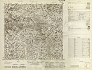 Hier finden Sie ein Meßtischblätter 1:25.000, von Deutschland, aus der Zeit der 1930er Jahre. Diese Karte wurde von Amerikanern damals bei Eisenschmidt gekauft und wurde in den USA für das amerikanische, später britische und französische Militär, bearbeitet. Überarbeitet in Form von Färbungen und Markierungen wurden diese Karten bis in die 50er Jahre.