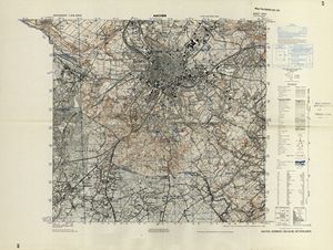 Hier finden Sie ein Meßtischblätter 1:25.000, von Deutschland, aus der Zeit der 1930er Jahre. Diese Karte wurde von Amerikanern damals bei Eisenschmidt gekauft und wurde in den USA für das amerikanische, später britische und französische Militär, bearbeitet. Überarbeitet in Form von Färbungen und Markierungen wurden diese Karten bis in die 50er Jahre.