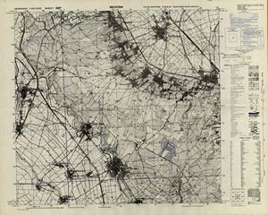 Hier finden Sie ein Meßtischblätter 1:25.000, von Deutschland, aus der Zeit der 1930er Jahre. Diese Karte wurde von Amerikanern damals bei Eisenschmidt gekauft und wurde in den USA für das amerikanische, später britische und französische Militär, bearbeitet. Überarbeitet in Form von Färbungen und Markierungen wurden diese Karten bis in die 50er Jahre.