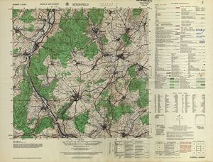 Hier finden Sie ein Meßtischblätter 1:25.000, von Deutschland, aus der Zeit der 1930er Jahre. Diese Karte wurde von Amerikanern damals bei Eisenschmidt gekauft und wurde in den USA für das amerikanische, später britische und französische Militär, bearbeitet. Überarbeitet in Form von Färbungen und Markierungen wurden diese Karten bis in die 50er Jahre.