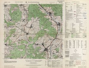 Hier finden Sie ein Meßtischblätter 1:25.000, von Deutschland, aus der Zeit der 1930er Jahre. Diese Karte wurde von Amerikanern damals bei Eisenschmidt gekauft und wurde in den USA für das amerikanische, später britische und französische Militär, bearbeitet. Überarbeitet in Form von Färbungen und Markierungen wurden diese Karten bis in die 50er Jahre.