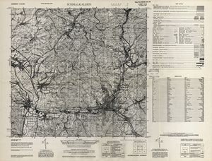 Hier finden Sie ein Meßtischblätter 1:25.000, von Deutschland, aus der Zeit der 1930er Jahre. Diese Karte wurde von Amerikanern damals bei Eisenschmidt gekauft und wurde in den USA für das amerikanische, später britische und französische Militär, bearbeitet. Überarbeitet in Form von Färbungen und Markierungen wurden diese Karten bis in die 50er Jahre.