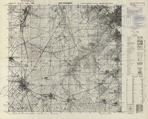 Hier finden Sie ein Meßtischblätter 1:25.000, von Deutschland, aus der Zeit der 1930er Jahre. Diese Karte wurde von Amerikanern damals bei Eisenschmidt gekauft und wurde in den USA für das amerikanische, später britische und französische Militär, bearbeitet. Überarbeitet in Form von Färbungen und Markierungen wurden diese Karten bis in die 50er Jahre.