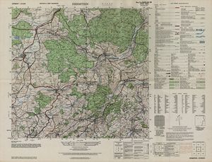 Hier finden Sie ein Meßtischblätter 1:25.000, von Deutschland, aus der Zeit der 1930er Jahre. Diese Karte wurde von Amerikanern damals bei Eisenschmidt gekauft und wurde in den USA für das amerikanische, später britische und französische Militär, bearbeitet. Überarbeitet in Form von Färbungen und Markierungen wurden diese Karten bis in die 50er Jahre.
