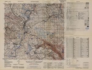 Hier finden Sie ein Meßtischblätter 1:25.000, von Deutschland, aus der Zeit der 1930er Jahre. Diese Karte wurde von Amerikanern damals bei Eisenschmidt gekauft und wurde in den USA für das amerikanische, später britische und französische Militär, bearbeitet. Überarbeitet in Form von Färbungen und Markierungen wurden diese Karten bis in die 50er Jahre.