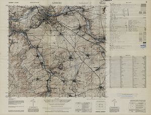 Hier finden Sie ein Meßtischblätter 1:25.000, von Deutschland, aus der Zeit der 1930er Jahre. Diese Karte wurde von Amerikanern damals bei Eisenschmidt gekauft und wurde in den USA für das amerikanische, später britische und französische Militär, bearbeitet. Überarbeitet in Form von Färbungen und Markierungen wurden diese Karten bis in die 50er Jahre.