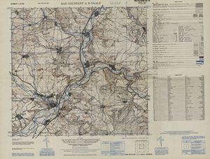 Hier finden Sie ein Meßtischblätter 1:25.000, von Deutschland, aus der Zeit der 1930er Jahre. Diese Karte wurde von Amerikanern damals bei Eisenschmidt gekauft und wurde in den USA für das amerikanische, später britische und französische Militär, bearbeitet. Überarbeitet in Form von Färbungen und Markierungen wurden diese Karten bis in die 50er Jahre.