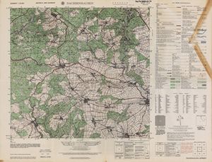 Hier finden Sie ein Meßtischblätter 1:25.000, von Deutschland, aus der Zeit der 1930er Jahre. Diese Karte wurde von Amerikanern damals bei Eisenschmidt gekauft und wurde in den USA für das amerikanische, später britische und französische Militär, bearbeitet. Überarbeitet in Form von Färbungen und Markierungen wurden diese Karten bis in die 50er Jahre.