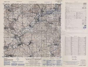 Hier finden Sie ein Meßtischblätter 1:25.000, von Deutschland, aus der Zeit der 1930er Jahre. Diese Karte wurde von Amerikanern damals bei Eisenschmidt gekauft und wurde in den USA für das amerikanische, später britische und französische Militär, bearbeitet. Überarbeitet in Form von Färbungen und Markierungen wurden diese Karten bis in die 50er Jahre.