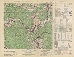 Hier finden Sie ein Meßtischblätter 1:25.000, von Deutschland, aus der Zeit der 1930er Jahre. Diese Karte wurde von Amerikanern damals bei Eisenschmidt gekauft und wurde in den USA für das amerikanische, später britische und französische Militär, bearbeitet. Überarbeitet in Form von Färbungen und Markierungen wurden diese Karten bis in die 50er Jahre.