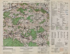 Hier finden Sie ein Meßtischblätter 1:25.000, von Deutschland, aus der Zeit der 1930er Jahre. Diese Karte wurde von Amerikanern damals bei Eisenschmidt gekauft und wurde in den USA für das amerikanische, später britische und französische Militär, bearbeitet. Überarbeitet in Form von Färbungen und Markierungen wurden diese Karten bis in die 50er Jahre.