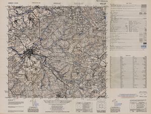 Hier finden Sie ein Meßtischblätter 1:25.000, von Deutschland, aus der Zeit der 1930er Jahre. Diese Karte wurde von Amerikanern damals bei Eisenschmidt gekauft und wurde in den USA für das amerikanische, später britische und französische Militär, bearbeitet. Überarbeitet in Form von Färbungen und Markierungen wurden diese Karten bis in die 50er Jahre.
