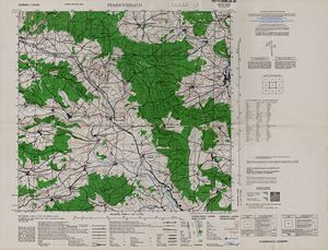 Hier finden Sie ein Meßtischblätter 1:25.000, von Deutschland, aus der Zeit der 1930er Jahre. Diese Karte wurde von Amerikanern damals bei Eisenschmidt gekauft und wurde in den USA für das amerikanische, später britische und französische Militär, bearbeitet. Überarbeitet in Form von Färbungen und Markierungen wurden diese Karten bis in die 50er Jahre.