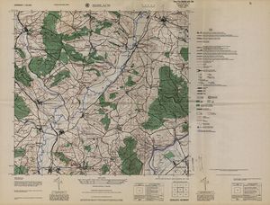 Hier finden Sie ein Meßtischblätter 1:25.000, von Deutschland, aus der Zeit der 1930er Jahre. Diese Karte wurde von Amerikanern damals bei Eisenschmidt gekauft und wurde in den USA für das amerikanische, später britische und französische Militär, bearbeitet. Überarbeitet in Form von Färbungen und Markierungen wurden diese Karten bis in die 50er Jahre.