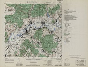 Hier finden Sie ein Meßtischblätter 1:25.000, von Deutschland, aus der Zeit der 1930er Jahre. Diese Karte wurde von Amerikanern damals bei Eisenschmidt gekauft und wurde in den USA für das amerikanische, später britische und französische Militär, bearbeitet. Überarbeitet in Form von Färbungen und Markierungen wurden diese Karten bis in die 50er Jahre.