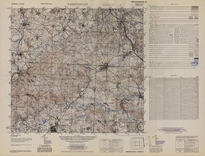 Hier finden Sie ein Meßtischblätter 1:25.000, von Deutschland, aus der Zeit der 1930er Jahre. Diese Karte wurde von Amerikanern damals bei Eisenschmidt gekauft und wurde in den USA für das amerikanische, später britische und französische Militär, bearbeitet. Überarbeitet in Form von Färbungen und Markierungen wurden diese Karten bis in die 50er Jahre.