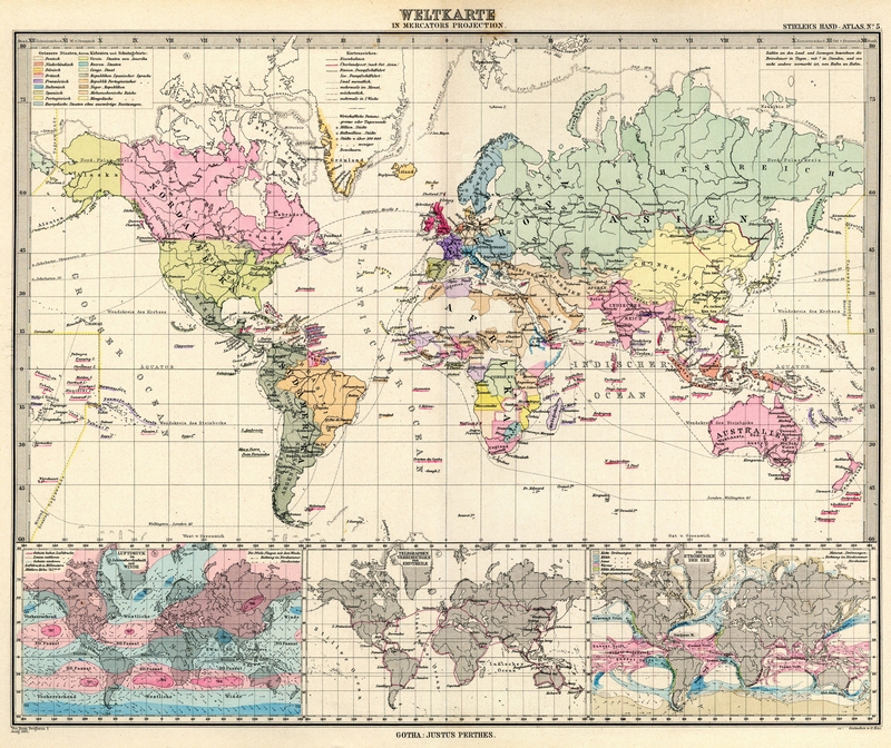 Weltkarte zur Übersicht der Meeresströmungen und des Schnellverkehrs – Stielers Weltatlas von 1881 – Karte 7)