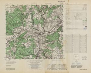 Hier finden Sie ein Meßtischblätter 1:25.000, von Deutschland, aus der Zeit der 1930er Jahre. Diese Karte wurde von Amerikanern damals bei Eisenschmidt gekauft und wurde in den USA für das amerikanische, später britische und französische Militär, bearbeitet. Überarbeitet in Form von Färbungen und Markierungen wurden diese Karten bis in die 50er Jahre.