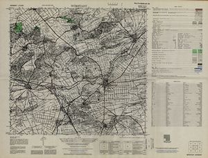 Hier finden Sie ein Meßtischblätter 1:25.000, von Deutschland, aus der Zeit der 1930er Jahre. Diese Karte wurde von Amerikanern damals bei Eisenschmidt gekauft und wurde in den USA für das amerikanische, später britische und französische Militär, bearbeitet. Überarbeitet in Form von Färbungen und Markierungen wurden diese Karten bis in die 50er Jahre.