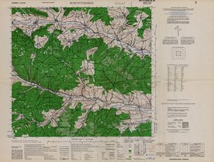Hier finden Sie ein Meßtischblätter 1:25.000, von Deutschland, aus der Zeit der 1930er Jahre. Diese Karte wurde von Amerikanern damals bei Eisenschmidt gekauft und wurde in den USA für das amerikanische, später britische und französische Militär, bearbeitet. Überarbeitet in Form von Färbungen und Markierungen wurden diese Karten bis in die 50er Jahre.