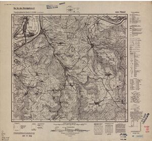 Hier finden Sie ein Meßtischblätter 1:25.000, von Deutschland, aus der Zeit der 1930er Jahre. Diese Karte wurde von Amerikanern damals bei Eisenschmidt gekauft und wurde in den USA für das amerikanische, später britische und französische Militär, bearbeitet. Überarbeitet in Form von Färbungen und Markierungen wurden diese Karten bis in die 50er Jahre.