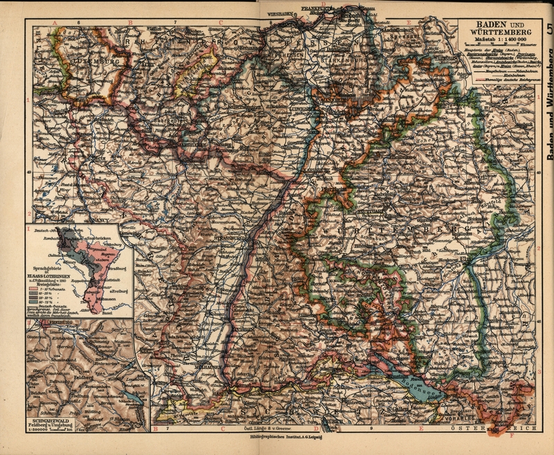 Baden-Württemberg. Nebenkarten: Schwarzwald (Feldberg und Umgebung) / Sprachgebiet in Elsaß.Lothringen (Meyers Volksatlas – Seite 5 / 1932)