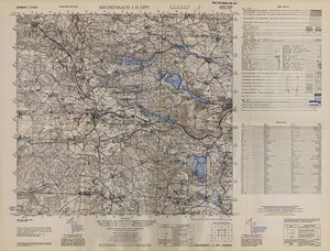 Hier finden Sie ein Meßtischblätter 1:25.000, von Deutschland, aus der Zeit der 1930er Jahre. Diese Karte wurde von Amerikanern damals bei Eisenschmidt gekauft und wurde in den USA für das amerikanische, später britische und französische Militär, bearbeitet. Überarbeitet in Form von Färbungen und Markierungen wurden diese Karten bis in die 50er Jahre.