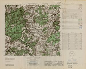 Hier finden Sie ein Meßtischblätter 1:25.000, von Deutschland, aus der Zeit der 1930er Jahre. Diese Karte wurde von Amerikanern damals bei Eisenschmidt gekauft und wurde in den USA für das amerikanische, später britische und französische Militär, bearbeitet. Überarbeitet in Form von Färbungen und Markierungen wurden diese Karten bis in die 50er Jahre.