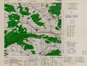 Hier finden Sie ein Meßtischblätter 1:25.000, von Deutschland, aus der Zeit der 1930er Jahre. Diese Karte wurde von Amerikanern damals bei Eisenschmidt gekauft und wurde in den USA für das amerikanische, später britische und französische Militär, bearbeitet. Überarbeitet in Form von Färbungen und Markierungen wurden diese Karten bis in die 50er Jahre.