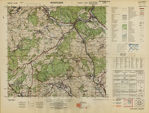 Hier finden Sie ein Meßtischblätter 1:25.000, von Deutschland, aus der Zeit der 1930er Jahre. Diese Karte wurde von Amerikanern damals bei Eisenschmidt gekauft und wurde in den USA für das amerikanische, später britische und französische Militär, bearbeitet. Überarbeitet in Form von Färbungen und Markierungen wurden diese Karten bis in die 50er Jahre.