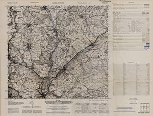 Hier finden Sie ein Meßtischblätter 1:25.000, von Deutschland, aus der Zeit der 1930er Jahre. Diese Karte wurde von Amerikanern damals bei Eisenschmidt gekauft und wurde in den USA für das amerikanische, später britische und französische Militär, bearbeitet. Überarbeitet in Form von Färbungen und Markierungen wurden diese Karten bis in die 50er Jahre.