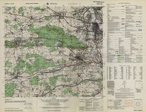 Hier finden Sie ein Meßtischblätter 1:25.000, von Deutschland, aus der Zeit der 1930er Jahre. Diese Karte wurde von Amerikanern damals bei Eisenschmidt gekauft und wurde in den USA für das amerikanische, später britische und französische Militär, bearbeitet. Überarbeitet in Form von Färbungen und Markierungen wurden diese Karten bis in die 50er Jahre.