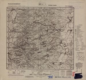 Hier finden Sie ein Meßtischblätter 1:25.000, von Deutschland, aus der Zeit der 1930er Jahre. Diese Karte wurde von Amerikanern damals bei Eisenschmidt gekauft und wurde in den USA für das amerikanische, später britische und französische Militär, bearbeitet. Überarbeitet in Form von Färbungen und Markierungen wurden diese Karten bis in die 50er Jahre.