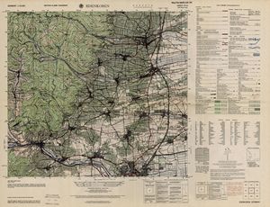Hier finden Sie ein Meßtischblätter 1:25.000, von Deutschland, aus der Zeit der 1930er Jahre. Diese Karte wurde von Amerikanern damals bei Eisenschmidt gekauft und wurde in den USA für das amerikanische, später britische und französische Militär, bearbeitet. Überarbeitet in Form von Färbungen und Markierungen wurden diese Karten bis in die 50er Jahre.