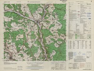 Hier finden Sie ein Meßtischblätter 1:25.000, von Deutschland, aus der Zeit der 1930er Jahre. Diese Karte wurde von Amerikanern damals bei Eisenschmidt gekauft und wurde in den USA für das amerikanische, später britische und französische Militär, bearbeitet. Überarbeitet in Form von Färbungen und Markierungen wurden diese Karten bis in die 50er Jahre.