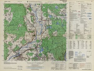 Hier finden Sie ein Meßtischblätter 1:25.000, von Deutschland, aus der Zeit der 1930er Jahre. Diese Karte wurde von Amerikanern damals bei Eisenschmidt gekauft und wurde in den USA für das amerikanische, später britische und französische Militär, bearbeitet. Überarbeitet in Form von Färbungen und Markierungen wurden diese Karten bis in die 50er Jahre.