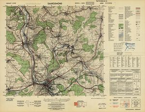 Hier finden Sie ein Meßtischblätter 1:25.000, von Deutschland, aus der Zeit der 1930er Jahre. Diese Karte wurde von Amerikanern damals bei Eisenschmidt gekauft und wurde in den USA für das amerikanische, später britische und französische Militär, bearbeitet. Überarbeitet in Form von Färbungen und Markierungen wurden diese Karten bis in die 50er Jahre.