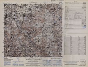 Hier finden Sie ein Meßtischblätter 1:25.000, von Deutschland, aus der Zeit der 1930er Jahre. Diese Karte wurde von Amerikanern damals bei Eisenschmidt gekauft und wurde in den USA für das amerikanische, später britische und französische Militär, bearbeitet. Überarbeitet in Form von Färbungen und Markierungen wurden diese Karten bis in die 50er Jahre.