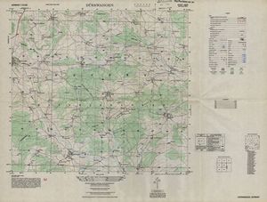 Hier finden Sie ein Meßtischblätter 1:25.000, von Deutschland, aus der Zeit der 1930er Jahre. Diese Karte wurde von Amerikanern damals bei Eisenschmidt gekauft und wurde in den USA für das amerikanische, später britische und französische Militär, bearbeitet. Überarbeitet in Form von Färbungen und Markierungen wurden diese Karten bis in die 50er Jahre.