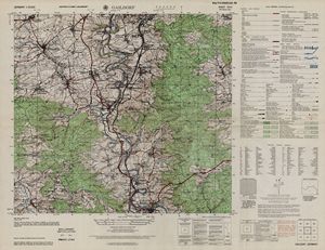 Hier finden Sie ein Meßtischblätter 1:25.000, von Deutschland, aus der Zeit der 1930er Jahre. Diese Karte wurde von Amerikanern damals bei Eisenschmidt gekauft und wurde in den USA für das amerikanische, später britische und französische Militär, bearbeitet. Überarbeitet in Form von Färbungen und Markierungen wurden diese Karten bis in die 50er Jahre.